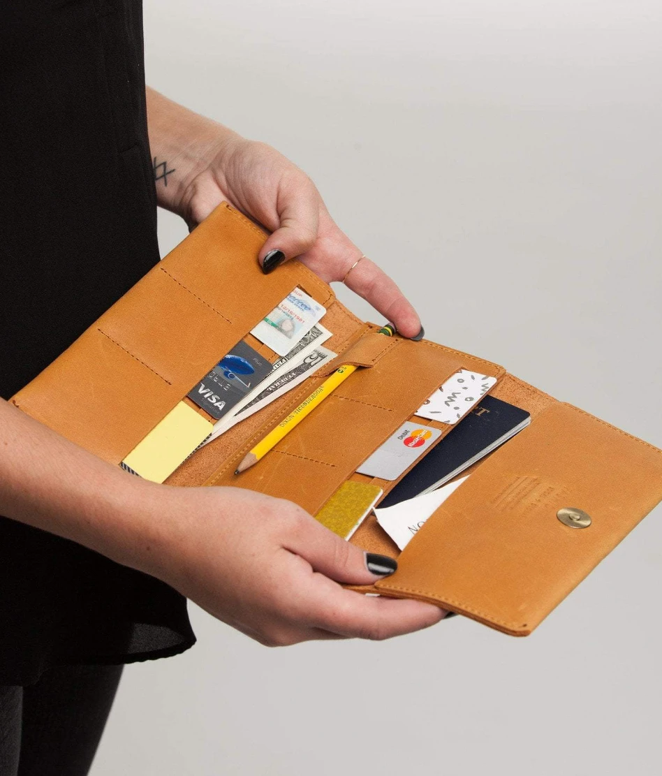 With a slim profile and simple design, the Debre Wallet is a minimalist’s dream. The interior features 6 card slots and 3 slit pockets that can be used to store cash, receipts, a checkbook, or passport. It can even store a small size journal and with the interior pen slot you’ll never again forget that clever idea or to-do list.
