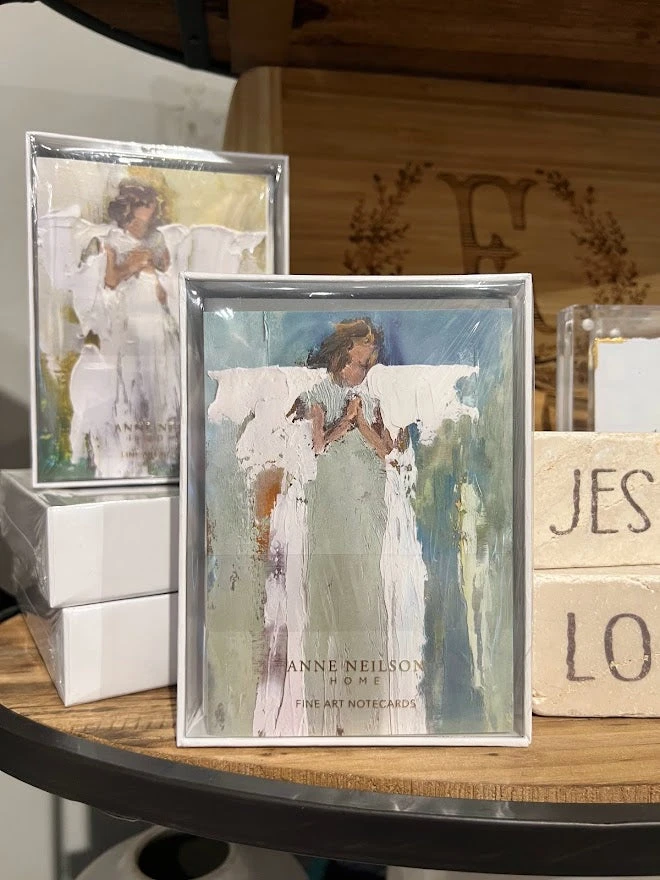Everyone loves a handwritten note and our beautiful fine art notecards are a blank canvas for your words. Whether you are sending a note of congratulations, encouragement or sympathy, our notecards share your thoughts with beauty and flair. Our Faithful Notecards feature the same angel throughout each pack and they also include a beautiful coordinating lined envelope. There area total of 14 notecards and envelopes included in each pack. Notecards are a 3.75 x 5.25 inch fold over card, blank inside.Â