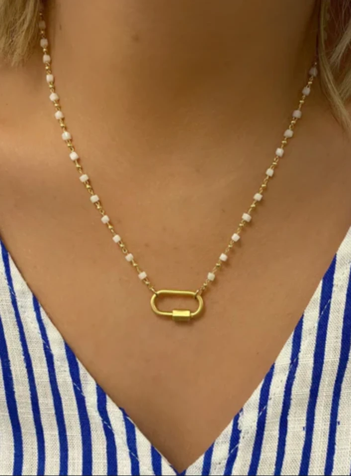 Gold Carabiner on white and gold beaded chain. Open to add charms!