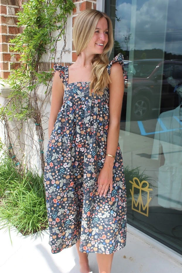 Nothing says summer like florals! This navy floral midi is so sweet and simple and features an empire waist and flutter sleeves!