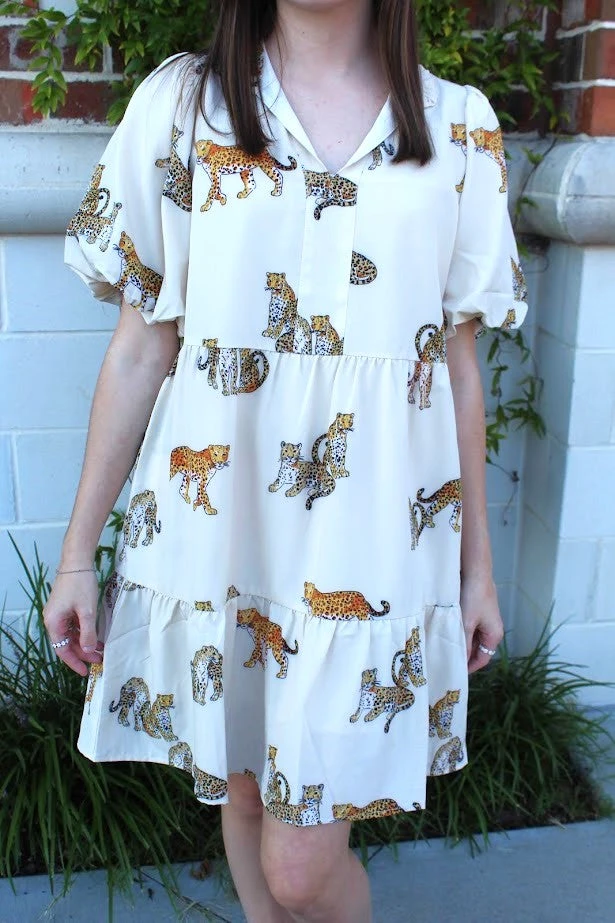 This fun cream and cheetah dress is absolutely darling! Featuring puff sleeves, a v-neck, and tiered styling, you will feel so trendy and fun in this mini dress.