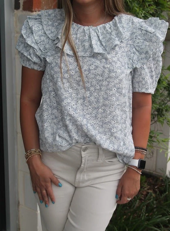 Wear this blue eyelet blouse to your next weekend outing or sunday brunch with the family! The ruffles around the puff sleeves and neckline make this dress simple, sweet, and easy to dress up with your favorite pants or skirt!