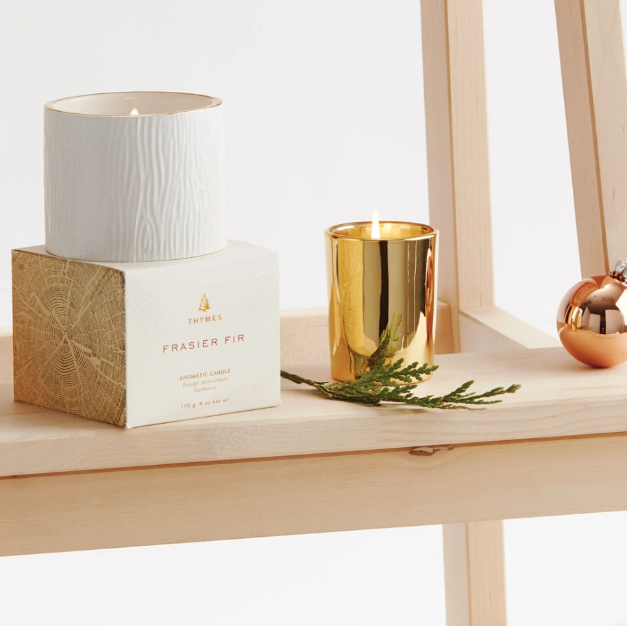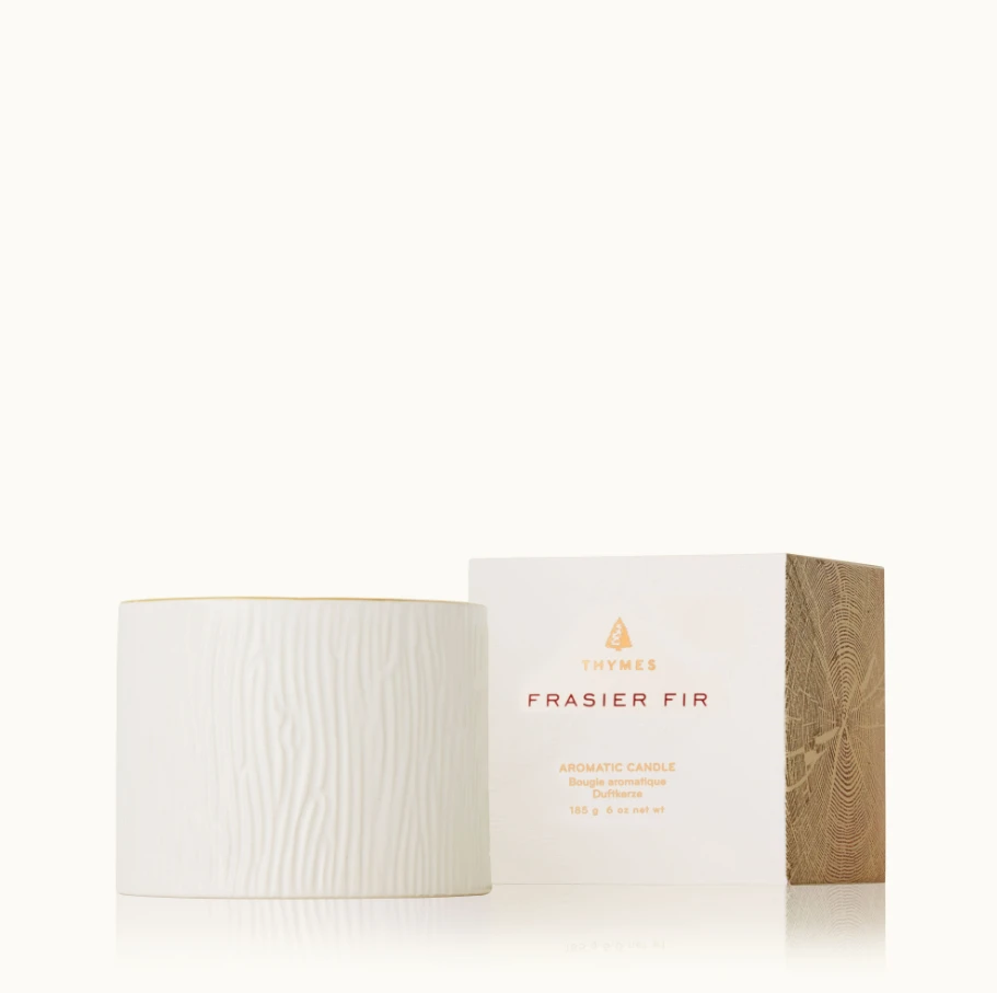 This aromatic candle features stunning wintery white wood grain ceramic, trimmed with a 24-karat gold rim. The fresh, just-cut forest fragrance of Frasier Fir fills any room with warmth and elegant ambiance.