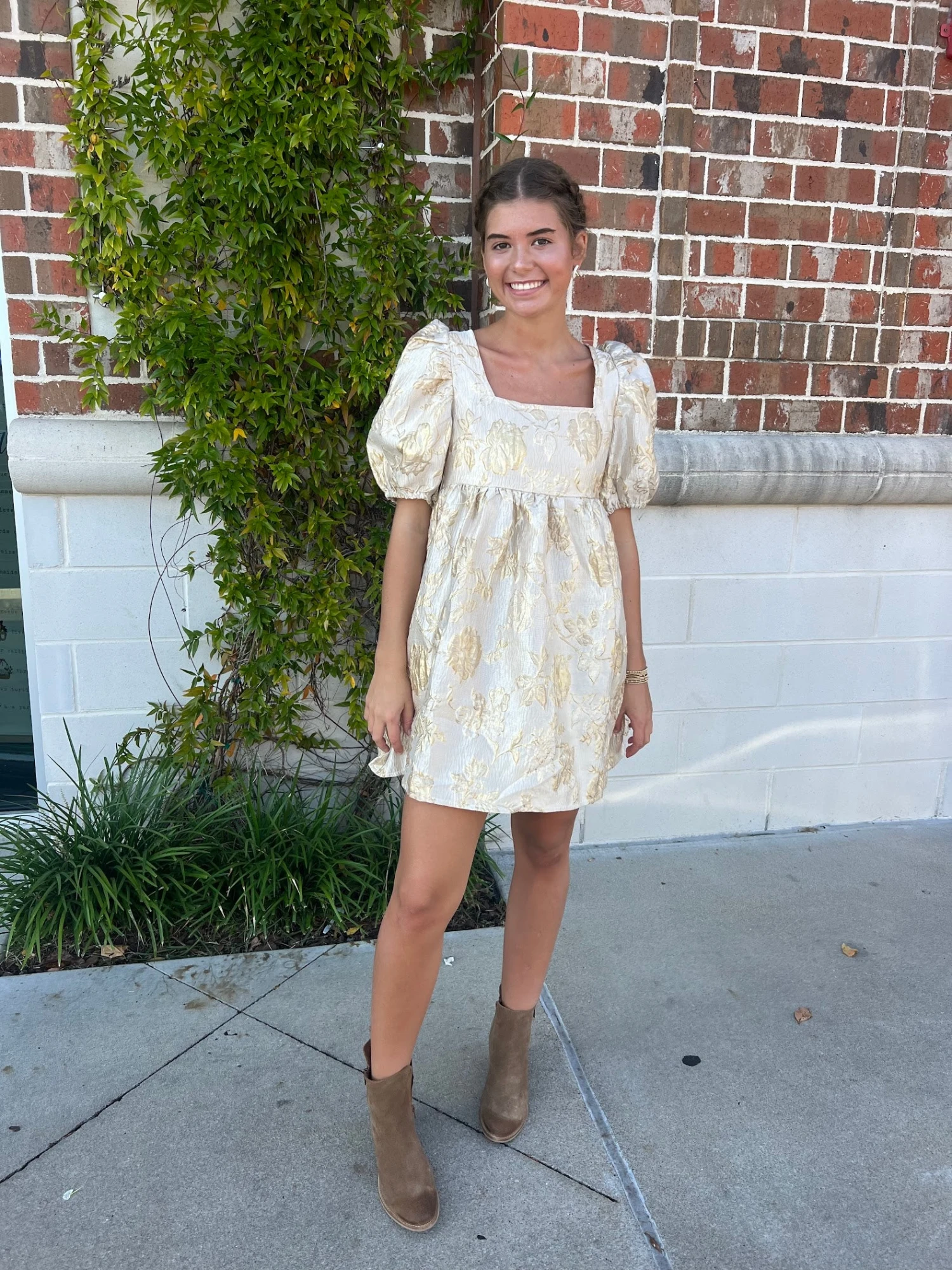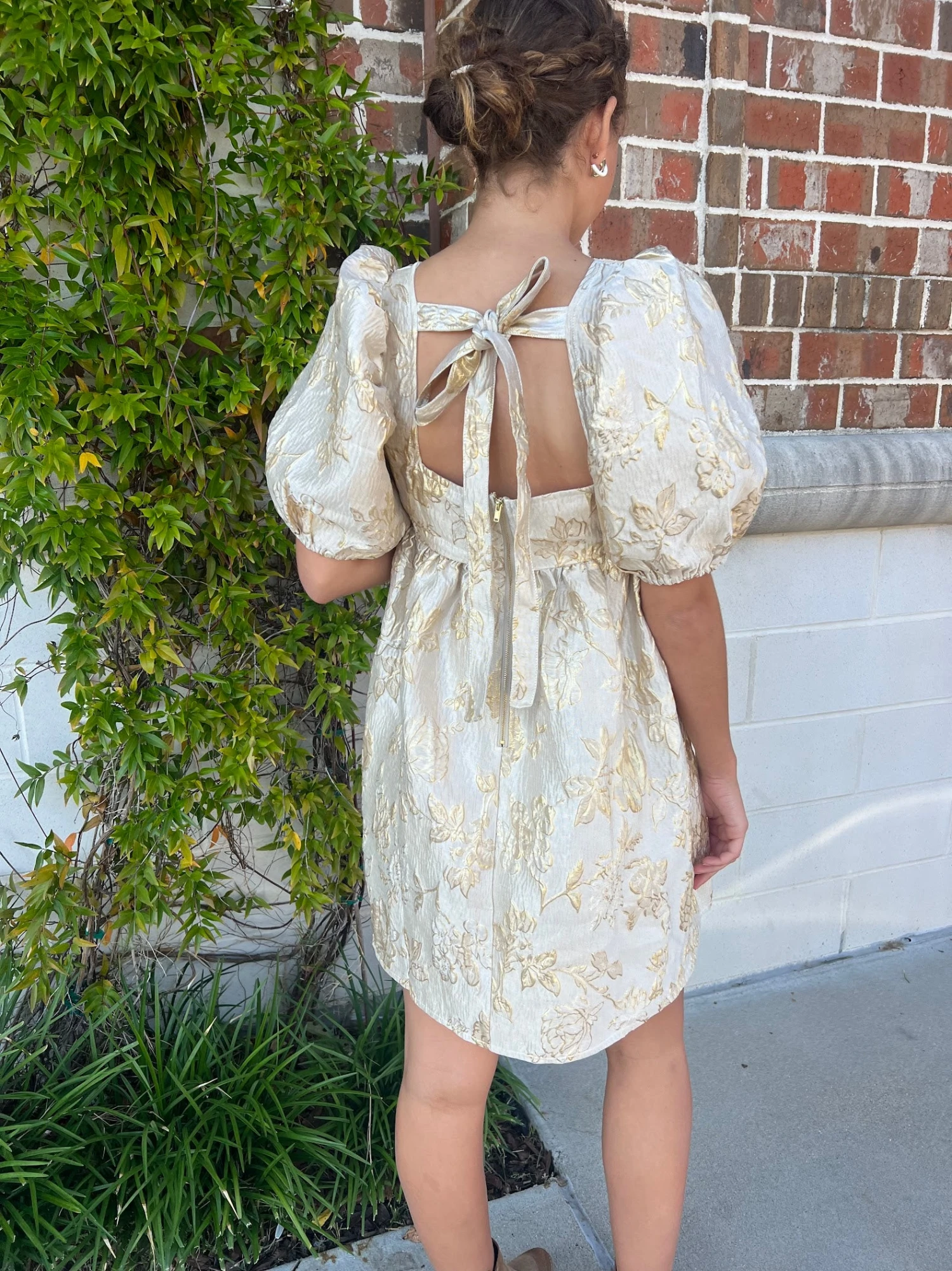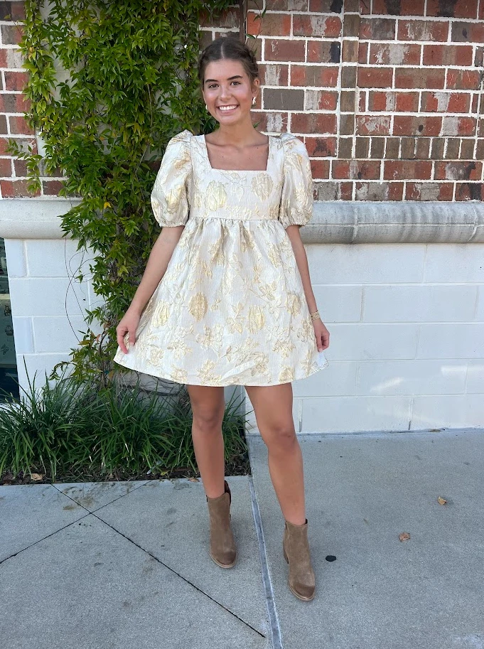 Look no further for the perfect holiday party dress! Featuring a square necklace, puff sleeves, and a tie back, this gold jacquard dress is sure to make you stand out at any occasion this winter season.