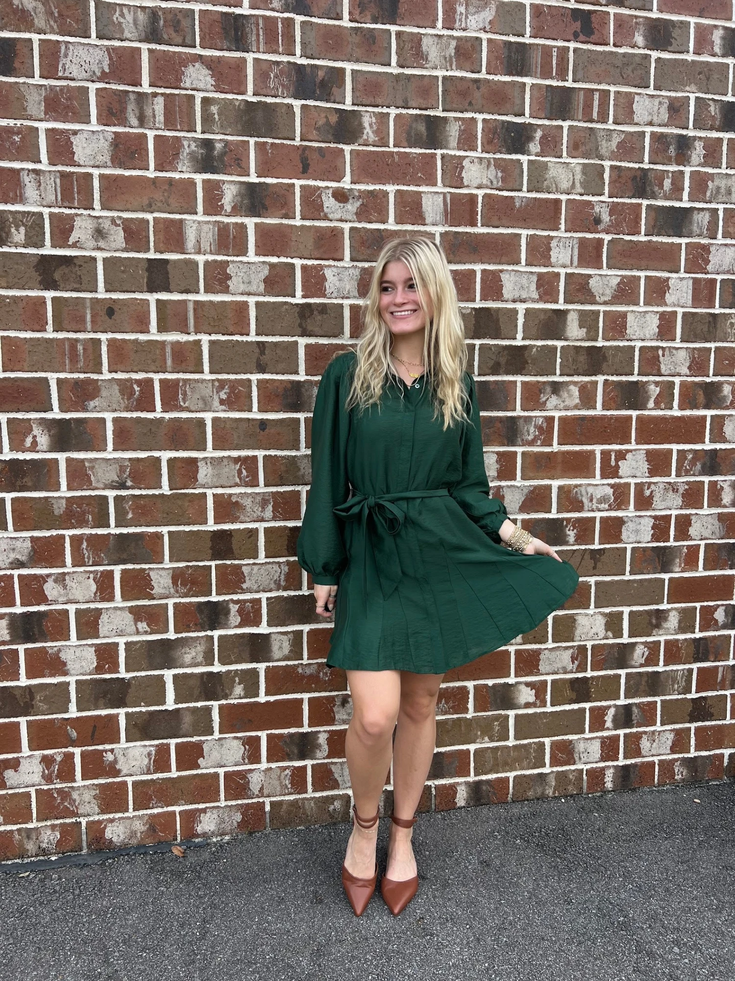 Look like a GEM in this Current Air Jewel Green Dress! With its pleated details and tie waist belt, you can attend any function in style.