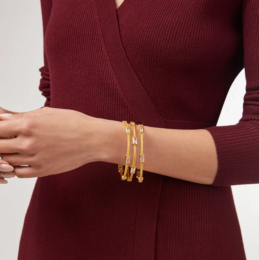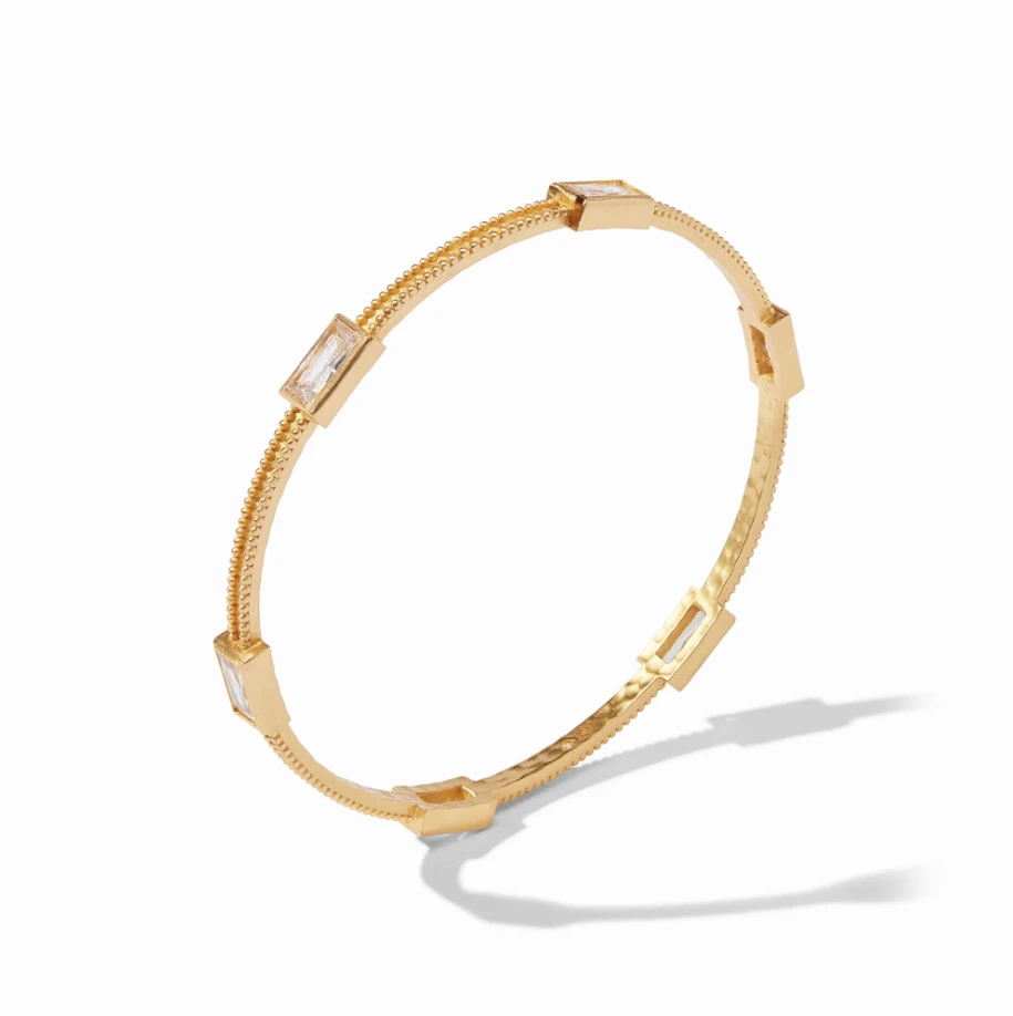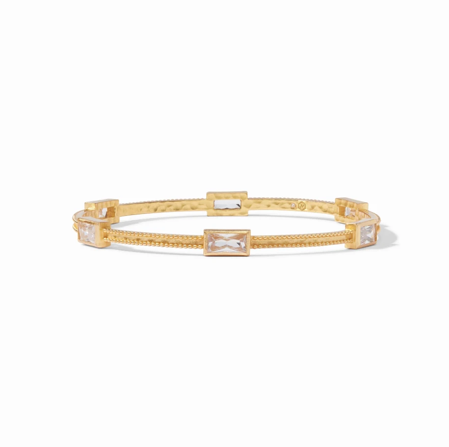Six baguette stones stud the length of this slim, textured bangle, lending it a crown-like appearance that’s stunning on its own, as well as doubled, tripped, or stacked alongside your own favorite bracelets and cuffs.