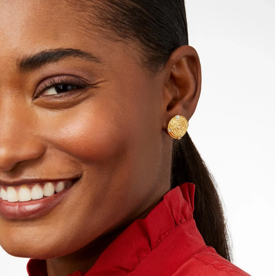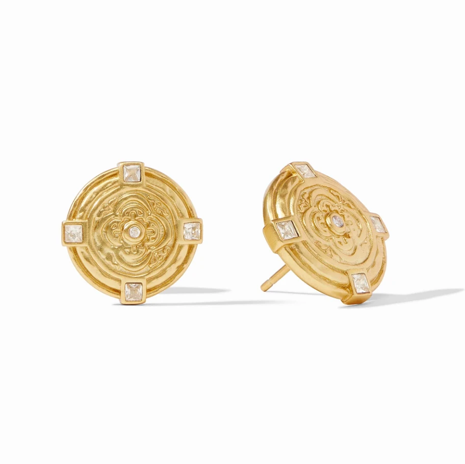 Discover antique elegance in this stud, featuring a bas relief golden quatrefoil coin surrounded by CZs set in a lightly hammered wall.