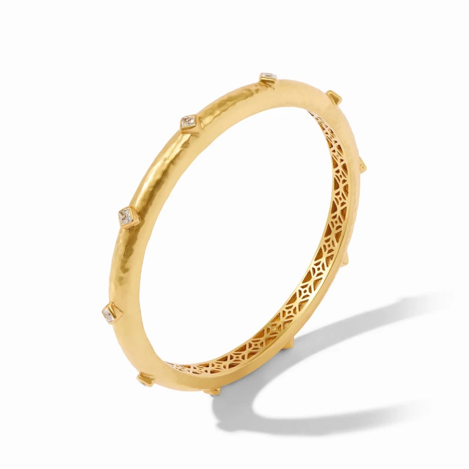 Ten diamond-shaped brilliant cut CZ gemstones embellish this lightly hammered bangle with a delicate piercework interior.