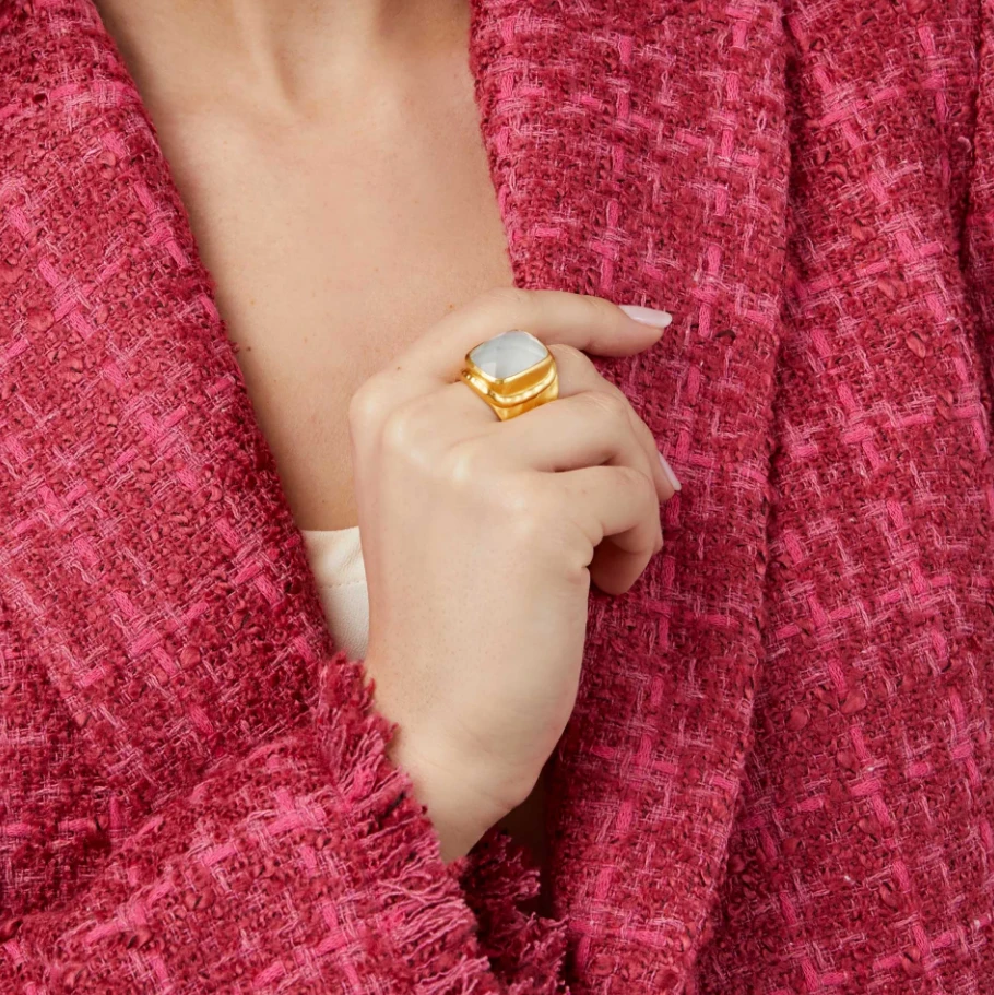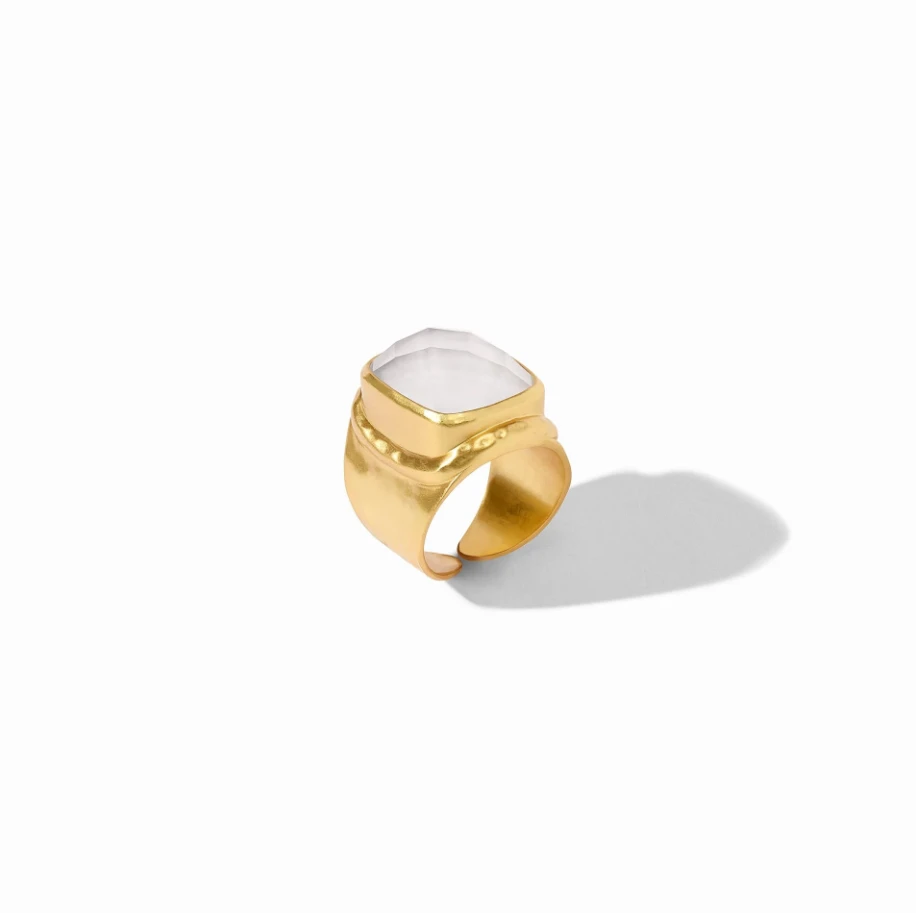 This regal, statement-making cocktail ring features a rose cut gemstone in a hammered surround with a wide golden shank.