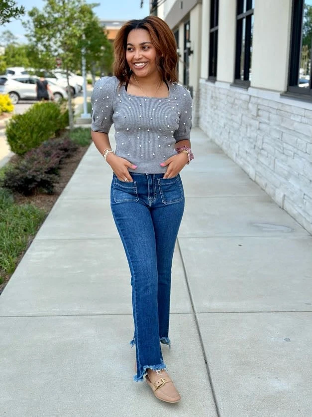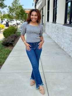 We love a short-sleeve sweater! This gray sweater with pearl detailing is the perfect transition piece for you summer to fall wardrobe!