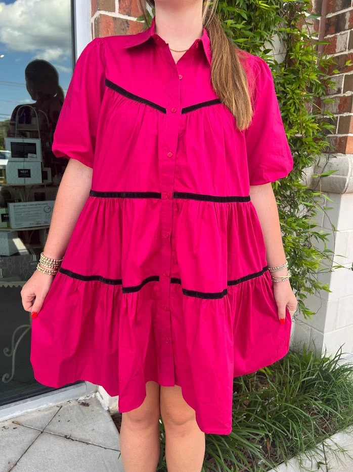 Calling all our pink lovers, this dress is for you! You’re sure to feel beautiful and bright in this hot pink button down style mini dress featuring black trim along the tiers!