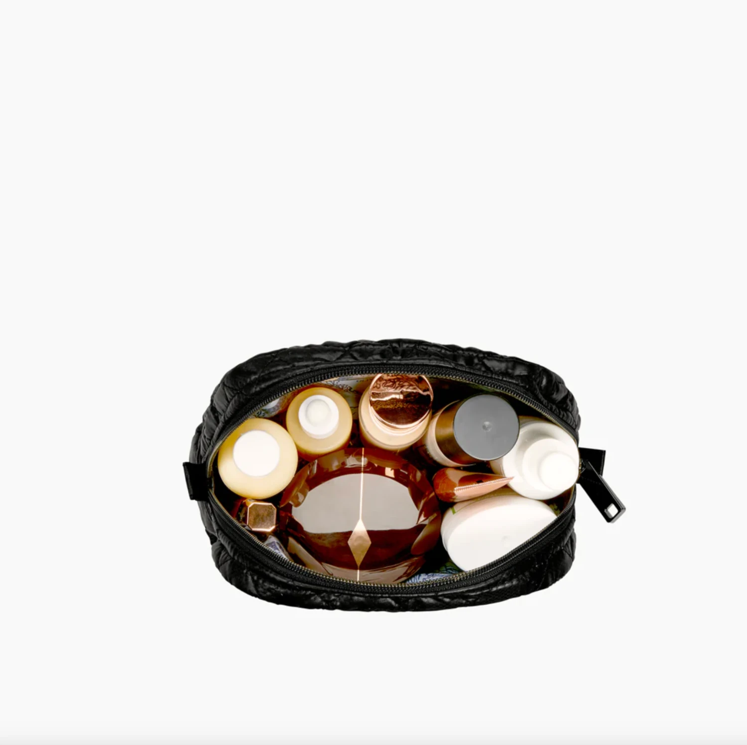 Room enough for all your makeup essentials, plus bonus space for things like backup nail polish, lip gloss or a flask. All this plus an easy clean, wipeable interior means you will never be a hot mess again.