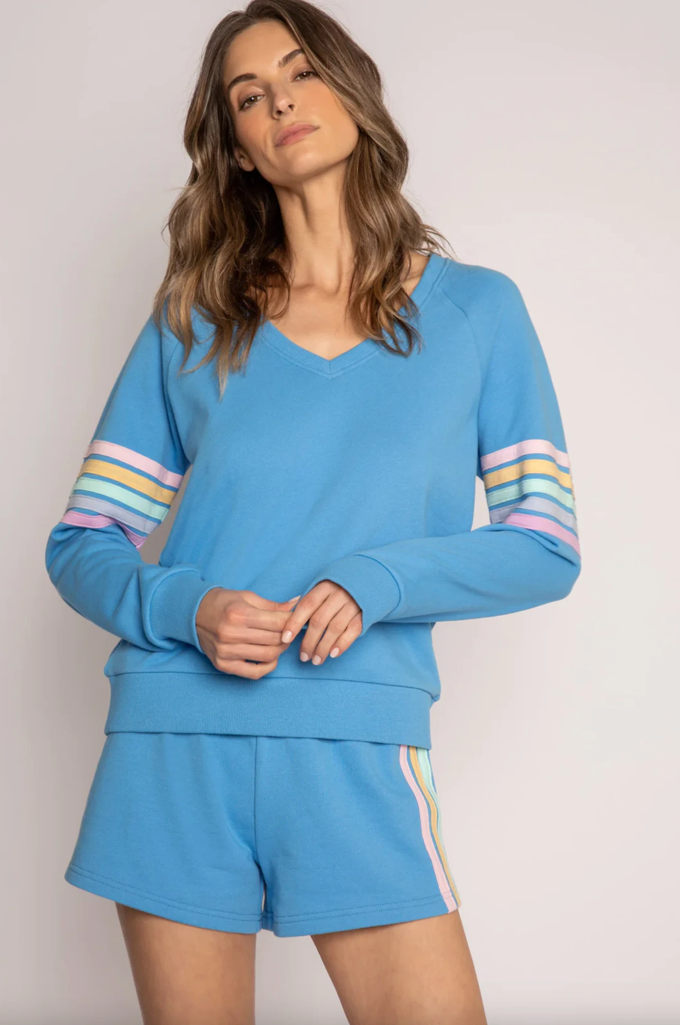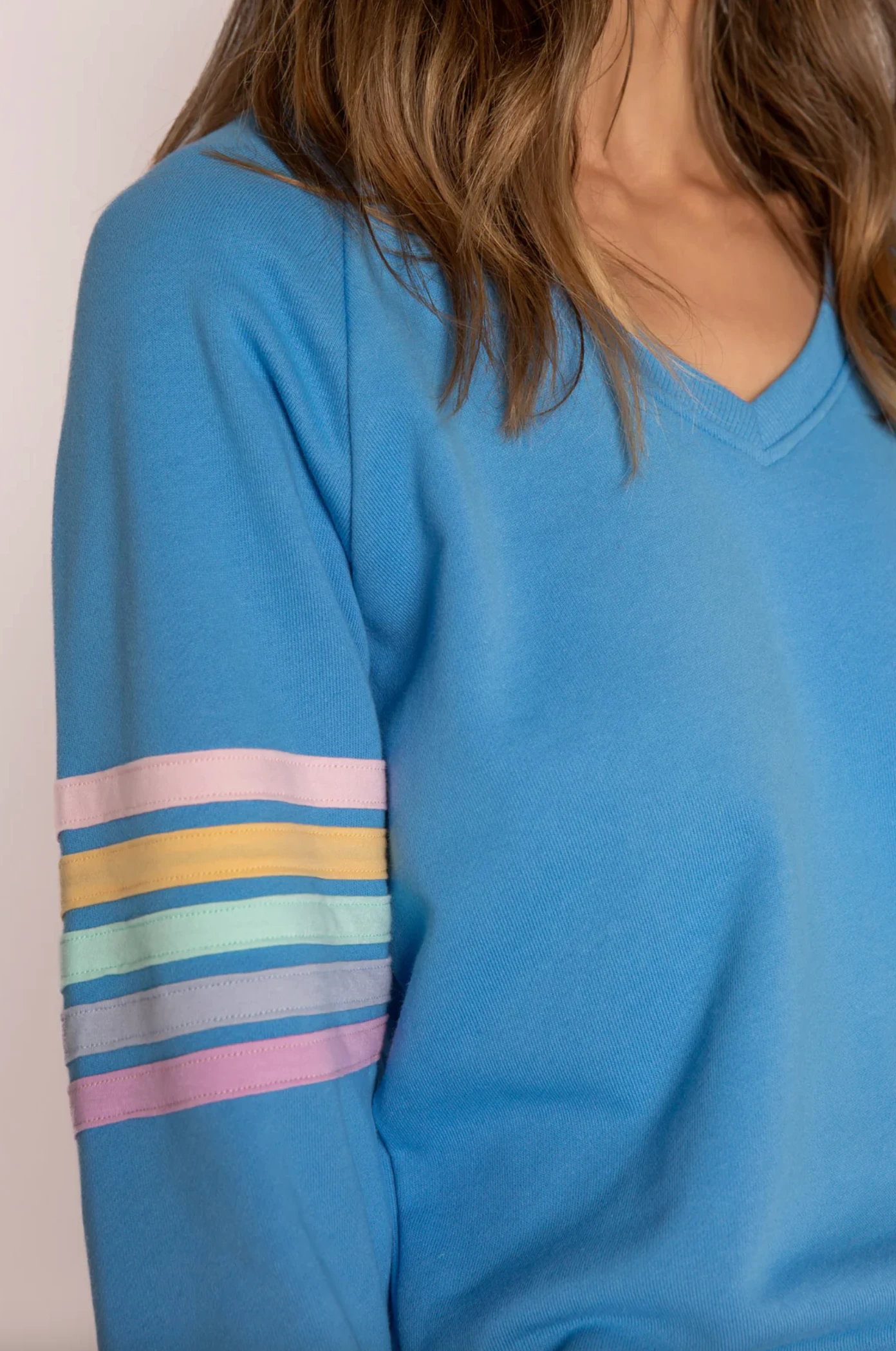 Keep things easy & cool in our pullover lounge top. Designed in a vibrant blue smooth-coat fleece, with knitted stripes on sleeves, it will take your everyday, up a notch.