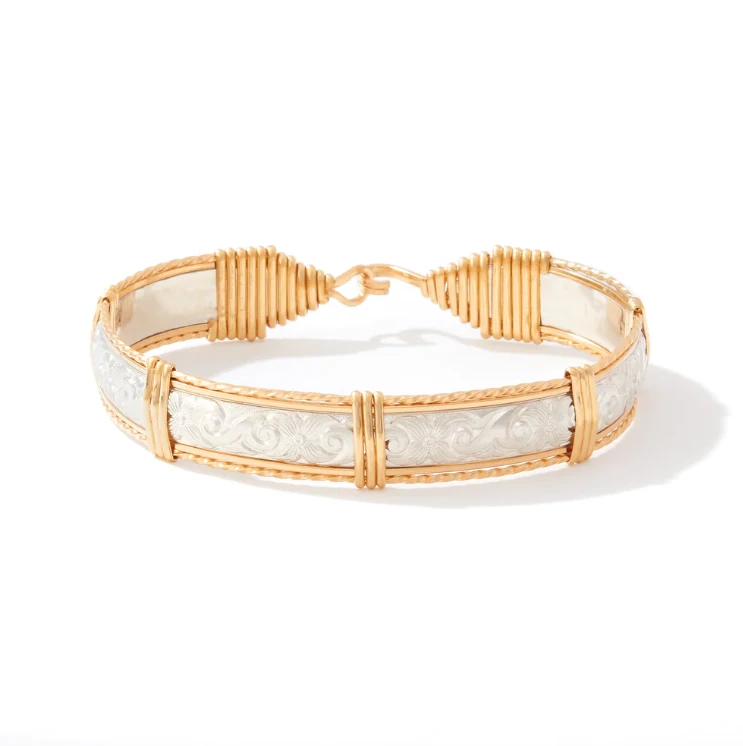 Inspired by his daughter, the Angelina Bracelet is one of the first bracelets created by Ronaldo which used a stamped silver bar as its central feature. He selected this unique silver bar pattern because he was impressed with the intricate scroll work in the pattern and felt that this beautiful design would perfectly reflect Krtisten’s courage and spirit.