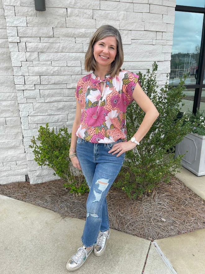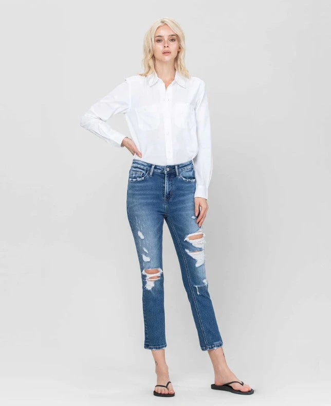 Comfort-stretch denim, slim fit, distressed detail, cropped length