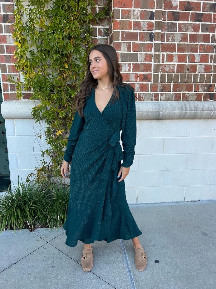 Introducing our enchanting Zenaida Green Midi Dress with long sleeves and a tie waist – the perfect attire for your upcoming Christmas party.